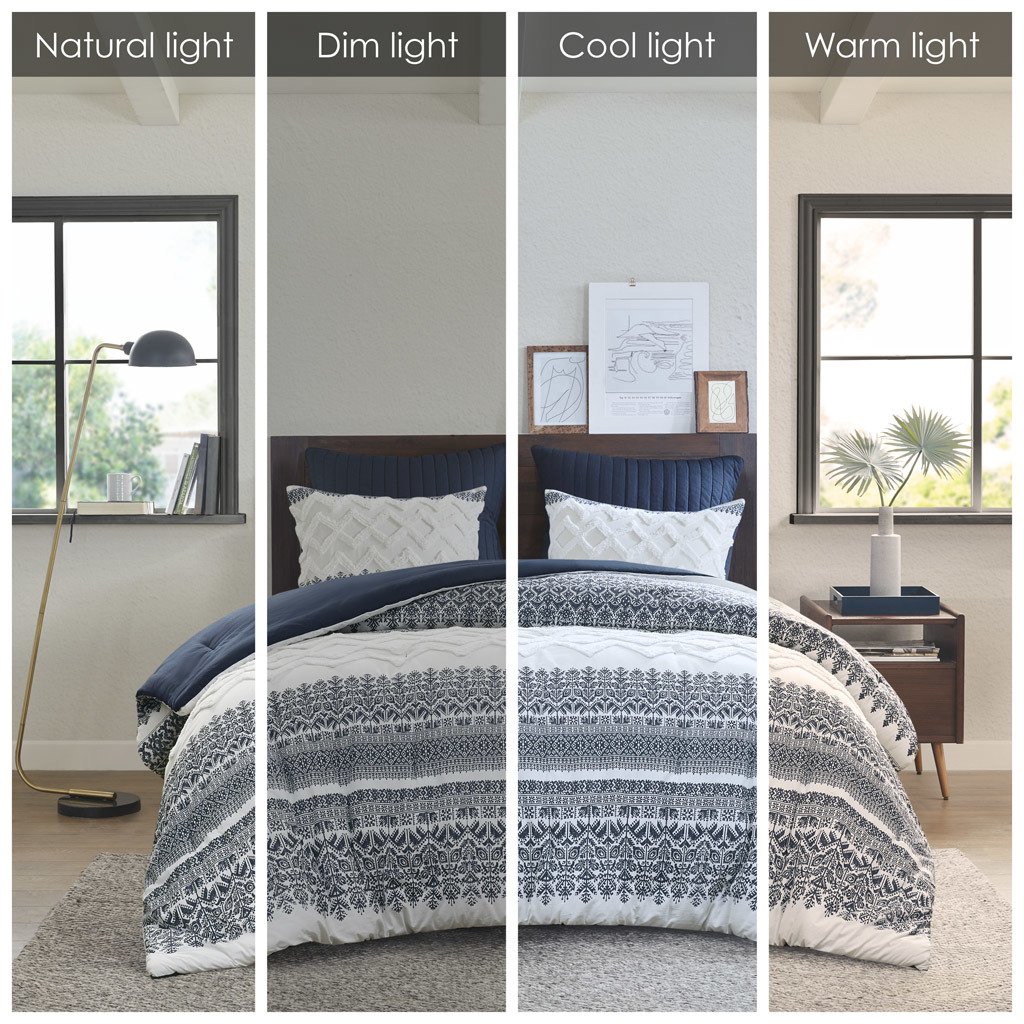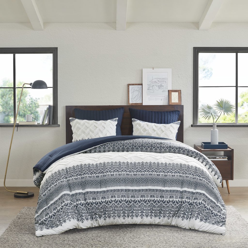Transform your bedroom with the charming shabby chic allure of the INK+IVY Mila 3 Piece Cotton Comforter Set with Chenille Tufting. The cotton comforter flaunts an updated navy botanic print, on a natural white ground, with tufted white chenille, in a chevron design, to create a charming farmhouse look. A solid navy reverse complements the top of the comforter, while hidden bartacking secures the hypoallergenic polyester filling without visible line for a clean finish. Two matching shams beautifully mimic the design of the comforter, completing the farmhouse comforter set. Machine washable, this cotton tufted comforter set offers soft comfort and a vivid touch that elevates your bedroom decor. This bedding set is also OEKO-TEX certified, meaning it does not contain any harmful substances or chemicals, ensuring quality comfort and wellness.