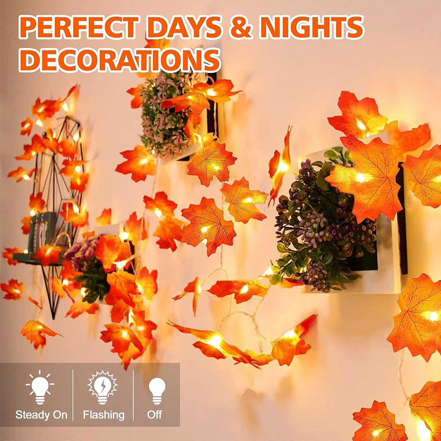 PERFECT DAYS & NIGHTS DECORATIONS: 3 modes equipped fall garland, Steady On, Flashing & Off, better for your all-day decor needs.