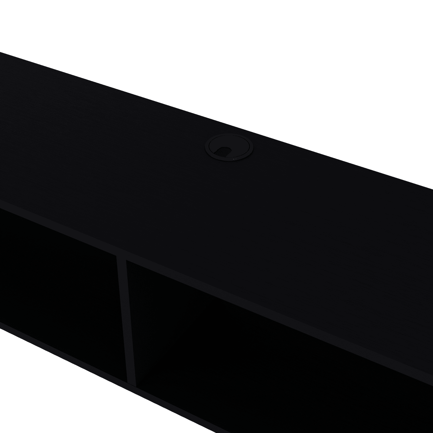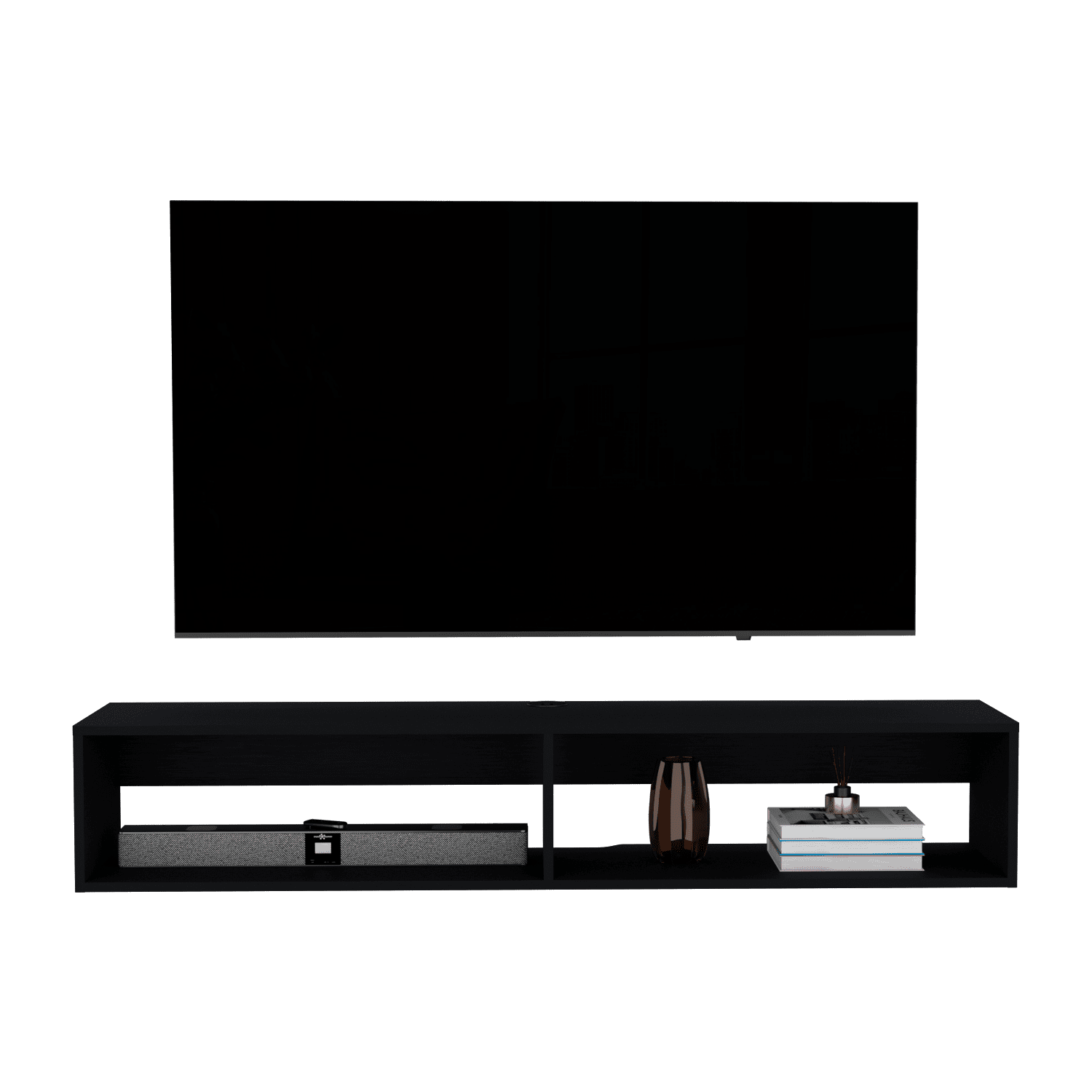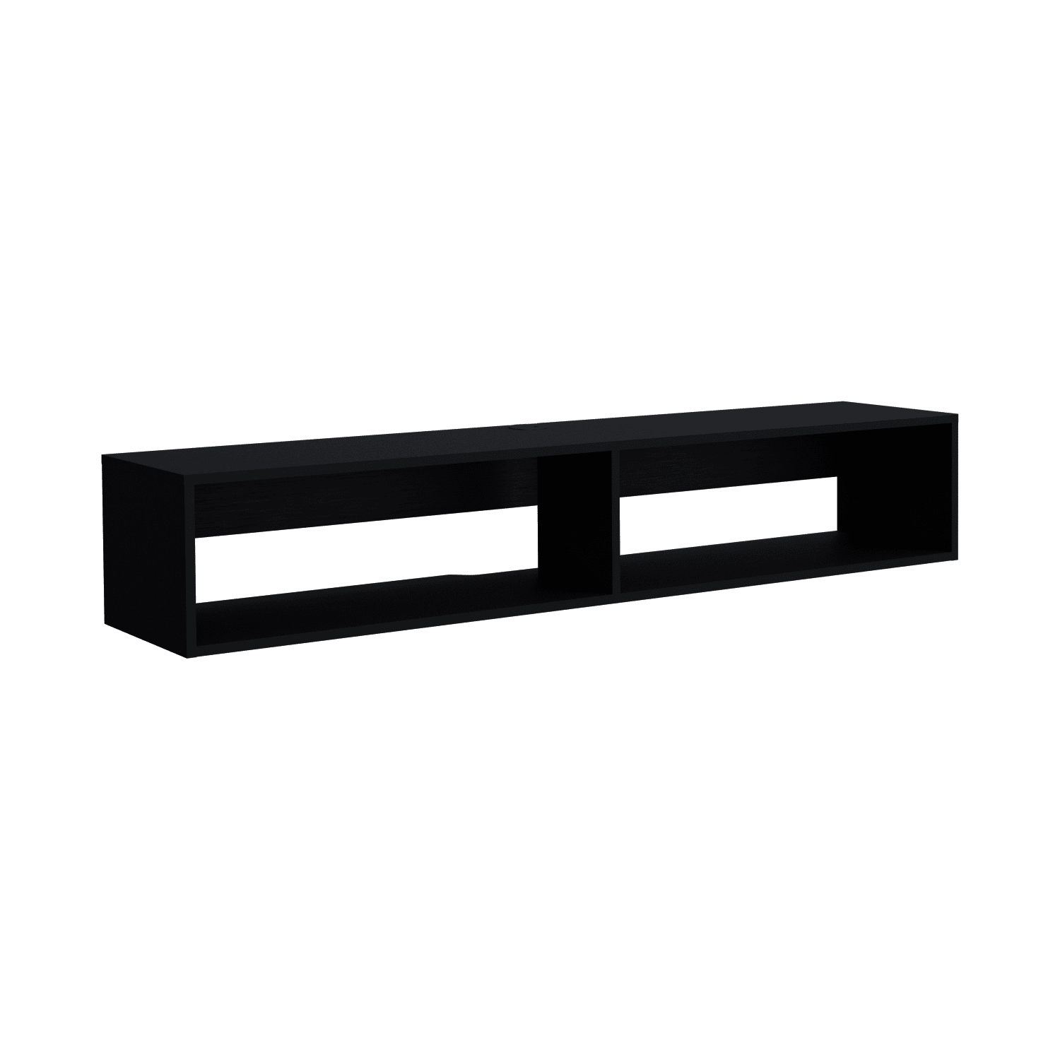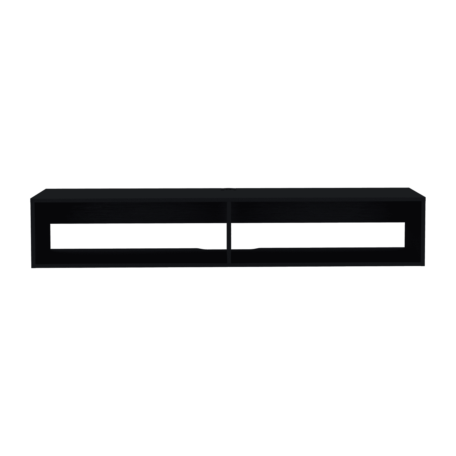 Elevate your living room with the modern and stylish Floating TV Stand Moore. Designed to seamlessly blend with your decor, this floating TV stand is crafted from black manufactured wood, offering both functionality and elegance. The Floating TV Stand Moore includes two spacious shelves (9.2"H x 8.8"D x 28.6"W) perfect for your media devices, decor, or storage needs. The built-in cable hole ensures neat and organized cable management, keeping your space clutter-free. Perfect for mounting your TV and creating a clean, contemporary look in your living room.Dimensions: Height: 10.4'Width: 59.1' Depth: 12.6'Furniture Type: Ready to assemble (full assembly required).Certifications: CARB phase II compliant – TSCA Title VI Compliant.Warranty: 1-year warranty coverage in wooden parts- 1-year warranty coverage in hardware pieces since its manufacturing date is found in the lot number printed in the product box.Shipment details: Free shipping to the 48 contiguous states - delivery time: Between 2 and 5 days, depending on the customer's location, season, and weather factors.Other details: This product does not include decorative or background elements; Check that the box is in good condition and well packed and check with the help of the manual that the corresponding parts have been included; For more information regarding warranty, shipment details, cancellations, returns & replacement parts go to the bottom section of our website to learn more; Installation & Assembly Instructions included.