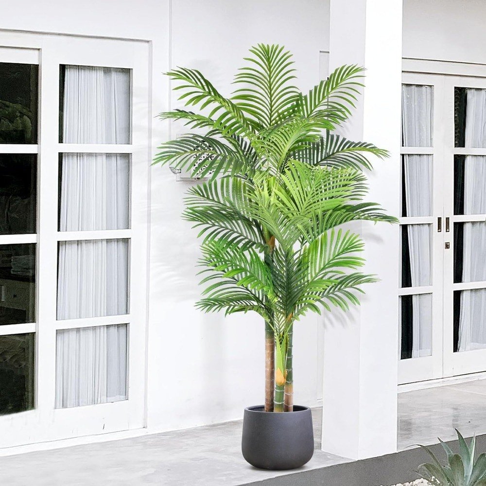 • ��This 6 feet majestic triple tropical golden cane palm artificial tree has 24 large vivid fronds filled with countless arching feather-like leaves with realistic palm texture, three lifelike bamboo trunks are very strong, it looks so lush and great, it will create a tropical paradise atmosphere for you and those around you, now this extra tall triple cane palm tree is waiting to dance in the warm tropical breezes