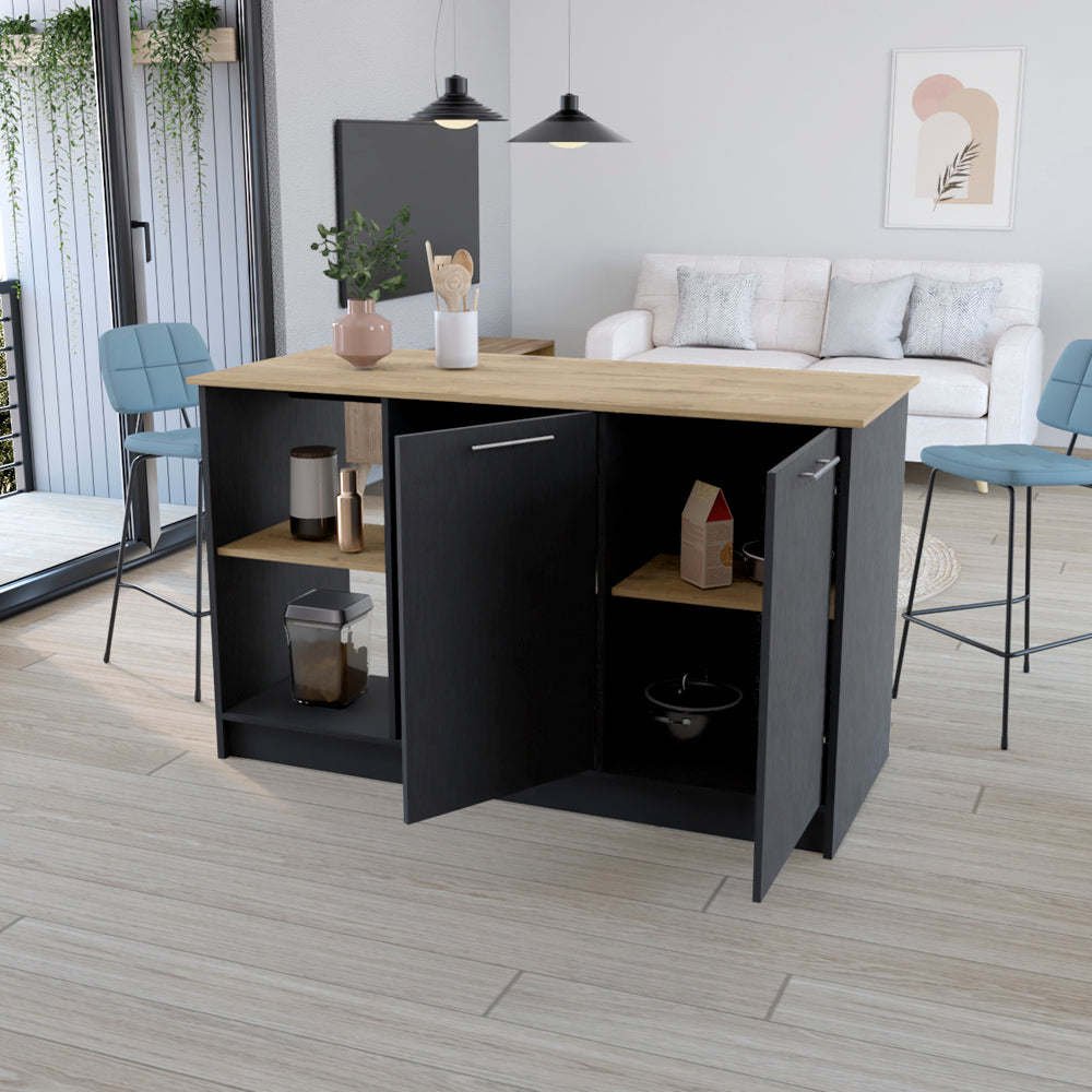 Meet the Kitchen Island Padua, where culinary finesse meets stylish functionality. Crafted with the modern chef in mind, it showcases a generous 59" W x 25.1" D countertop, making meal prepping a delight or even moonlighting as a chic dining table. Dual open storage shelves, each measuring 14.8"H x 17.2"W, keep ingredients or utensils within easy reach. Complementing this is a double-door cabinet, thoughtfully designed with inner shelves to tuck away cookware or groceries. All are elegantly framed in durable white/light oak, black/macadamia, black/onyx or white/onyx manufactured wood finishes.Dimensions:Height: 35,4" Width: 59'Depth: 25,1'Furniture Type: Ready to assemble (full assembly required).Certifications: CARB phase II compliant – TSCA Title VI Compliant.Warranty: 1-year warranty coverage in wooden parts- 1-year warranty coverage in hardware pieces since its manufacturing date found in the lot number printed in the product box.