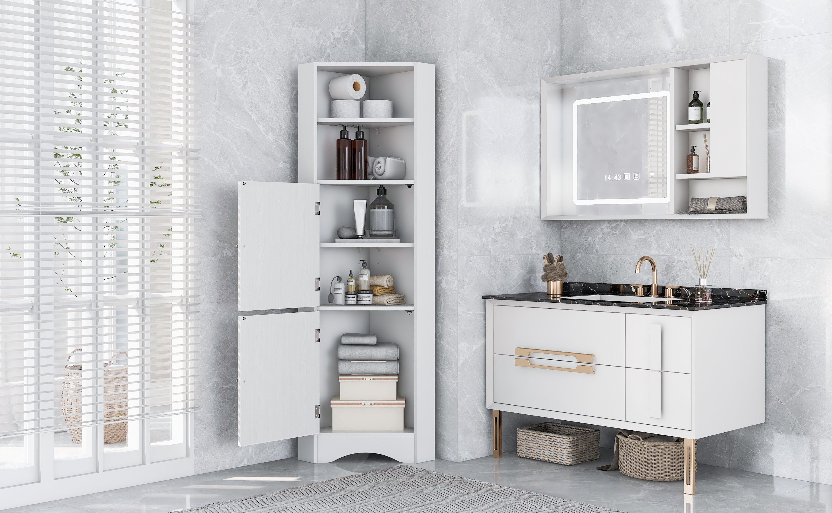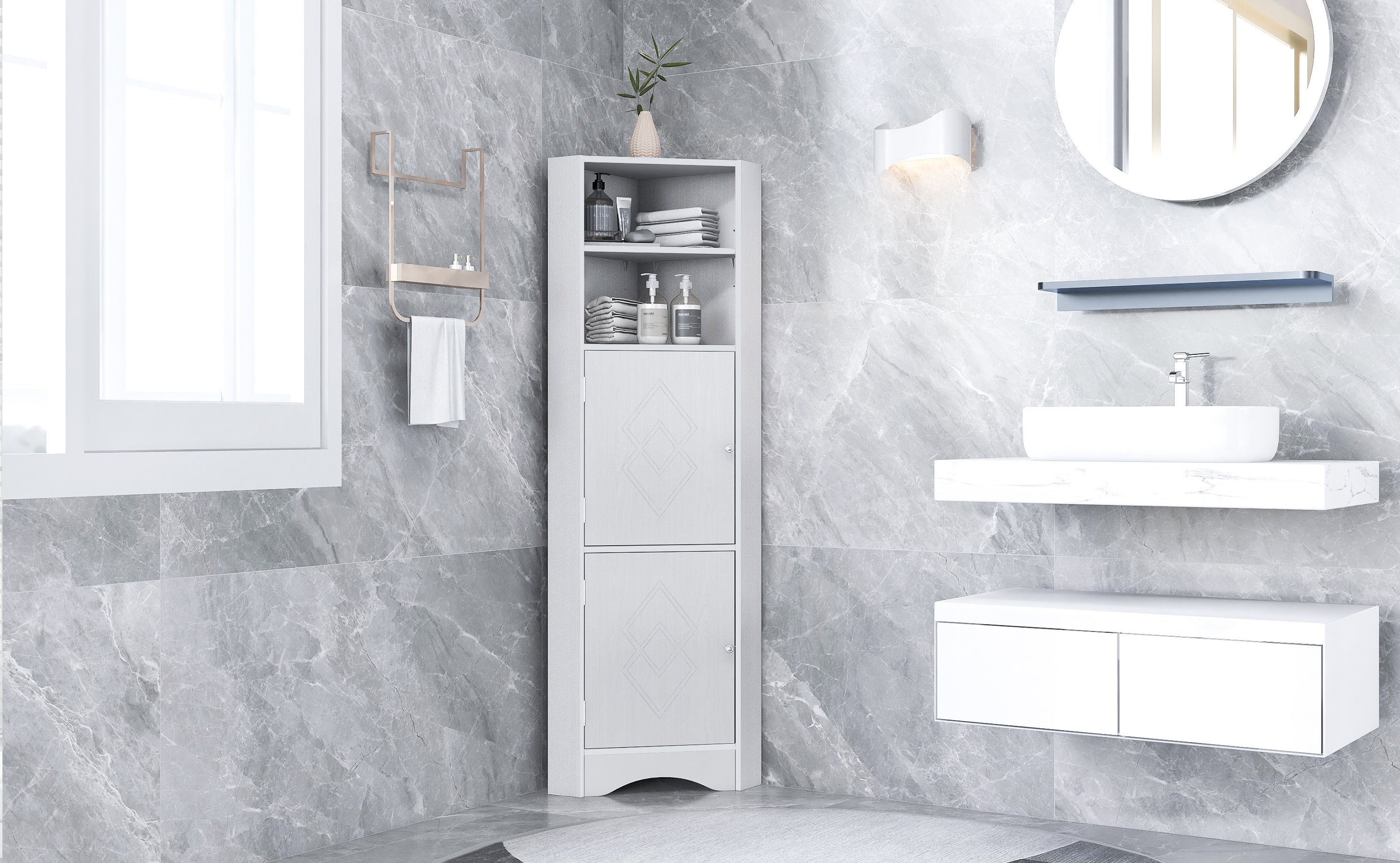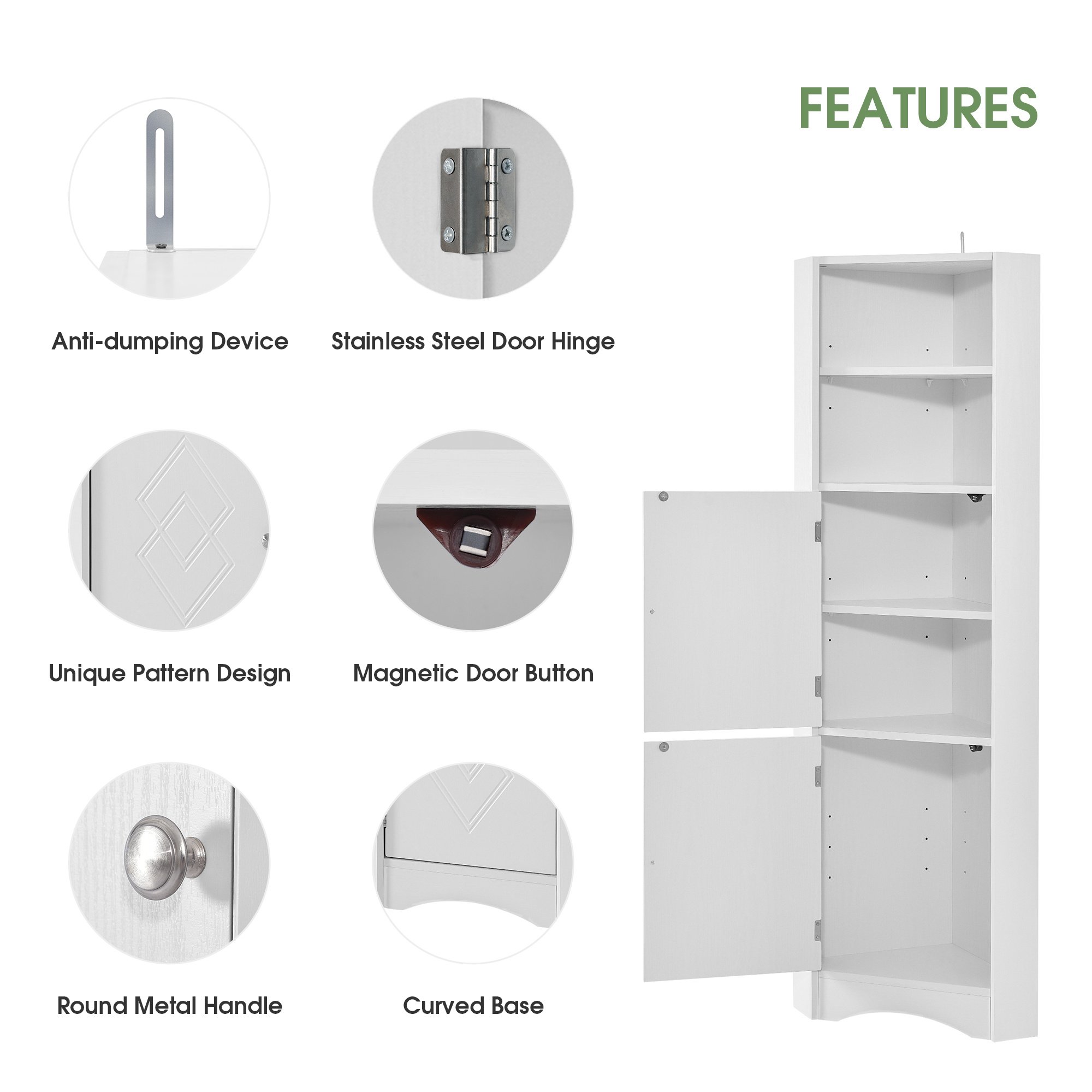 5.[Stylish and Considerate Details]: The bathroom cabinet is designed as a triangle shape to stand in the corner to save more space in your home. Furthermore, the rhombus pattern on the door and curved line in the base add more elegant elements to this cabinet. Metal round door handles and magnet door button comfort users when open and close the door.