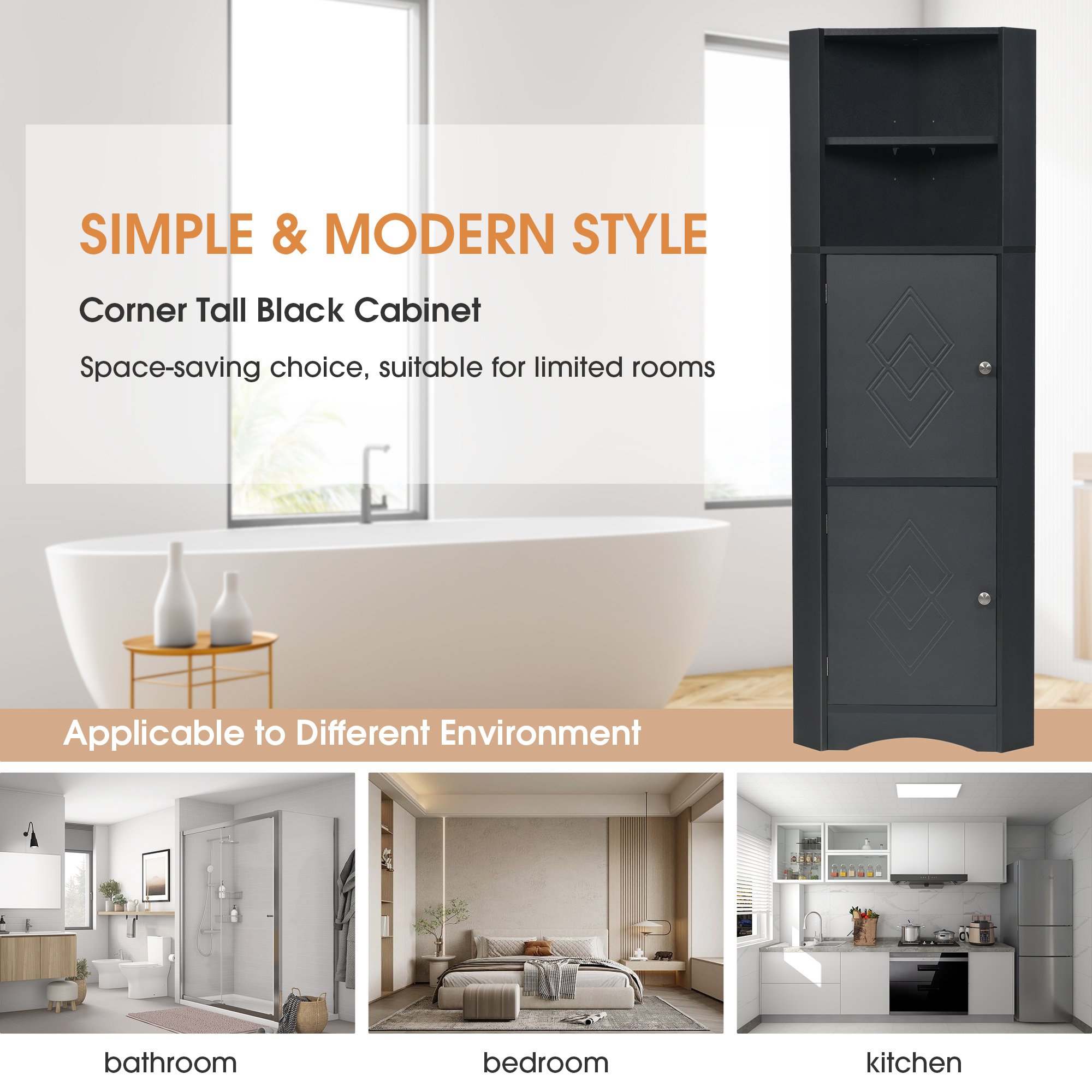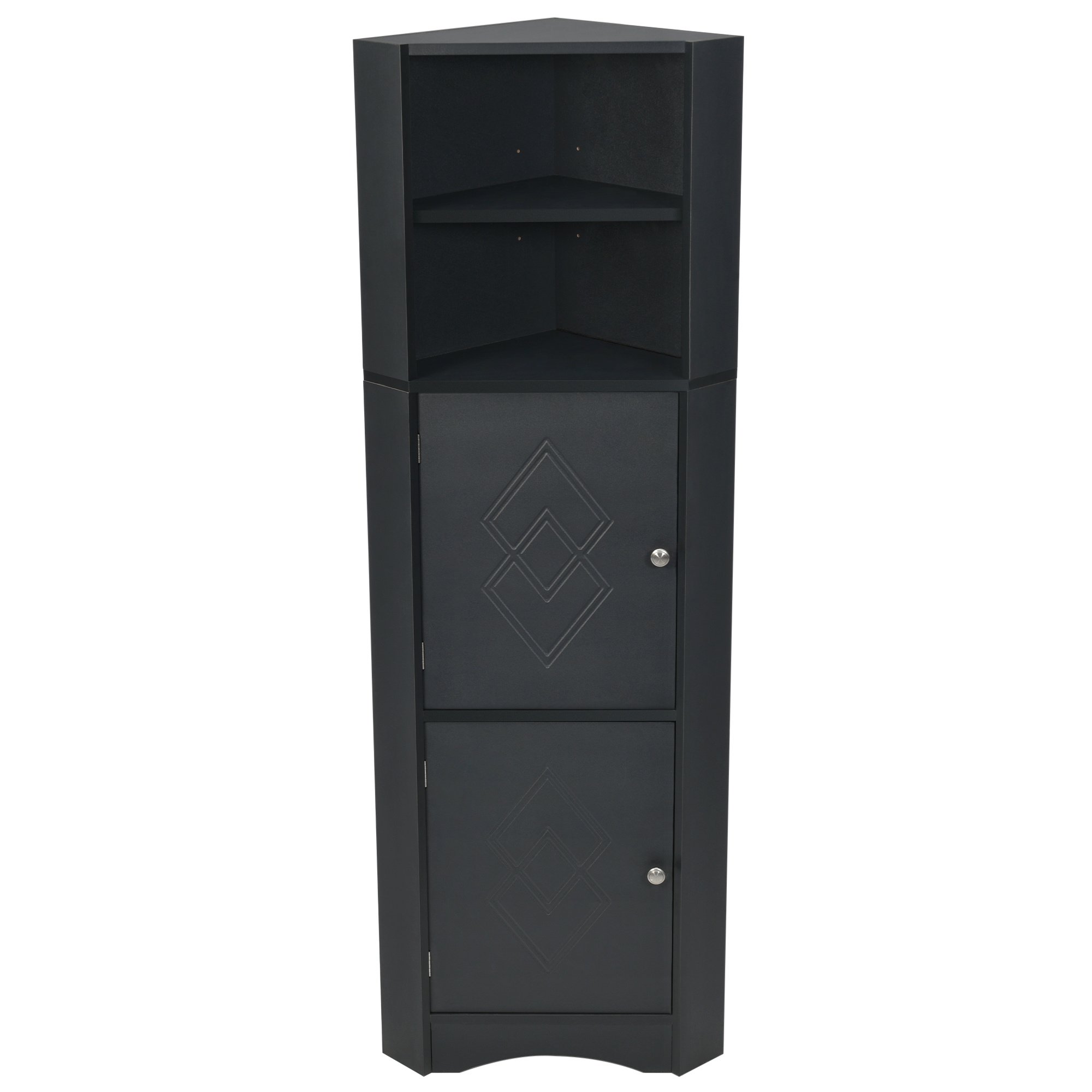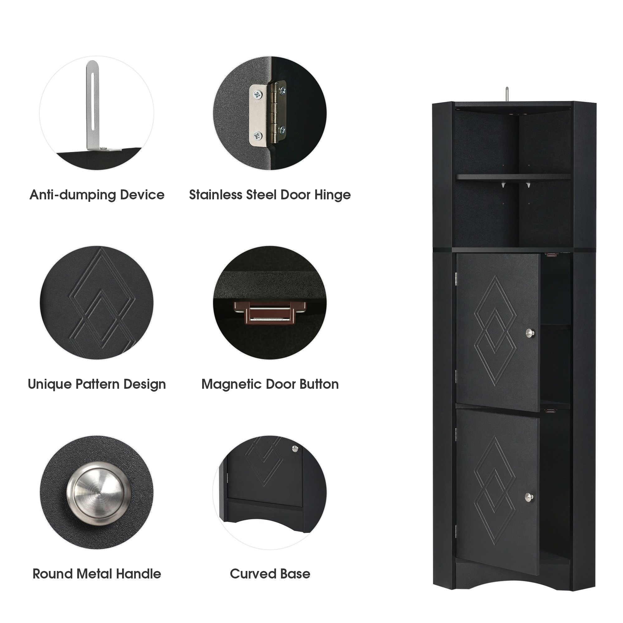 5.[Stylish and Considerate Details]: The bathroom cabinet is designed as a triangle shape to stand in the corner to save more space in your home. Furthermore, the rhombus pattern on the door and curved line in the base add more elegant elements to this cabinet. Metal round door handles and magnet door button comfort users when open and close the door.