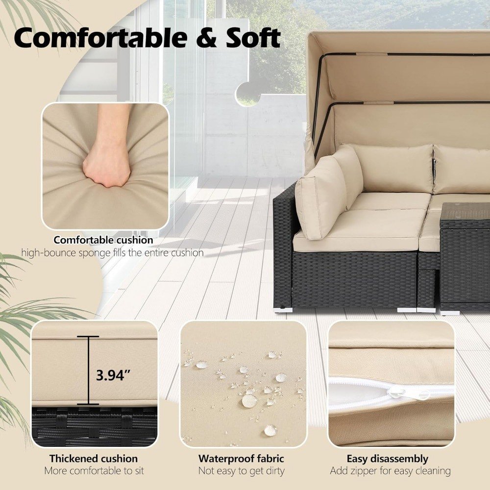 • Thickened Cushions: We have upgraded outdoor day bed with canopy set, and thickened the cushion. Using high-density sponge cushions, are elastic and soft, increasing the comfort. The cushions are designed with a zipper, which is easy to disassemble and clean. All cushions will not easily slip off. Our patio sofa set can provide you with great comfort.