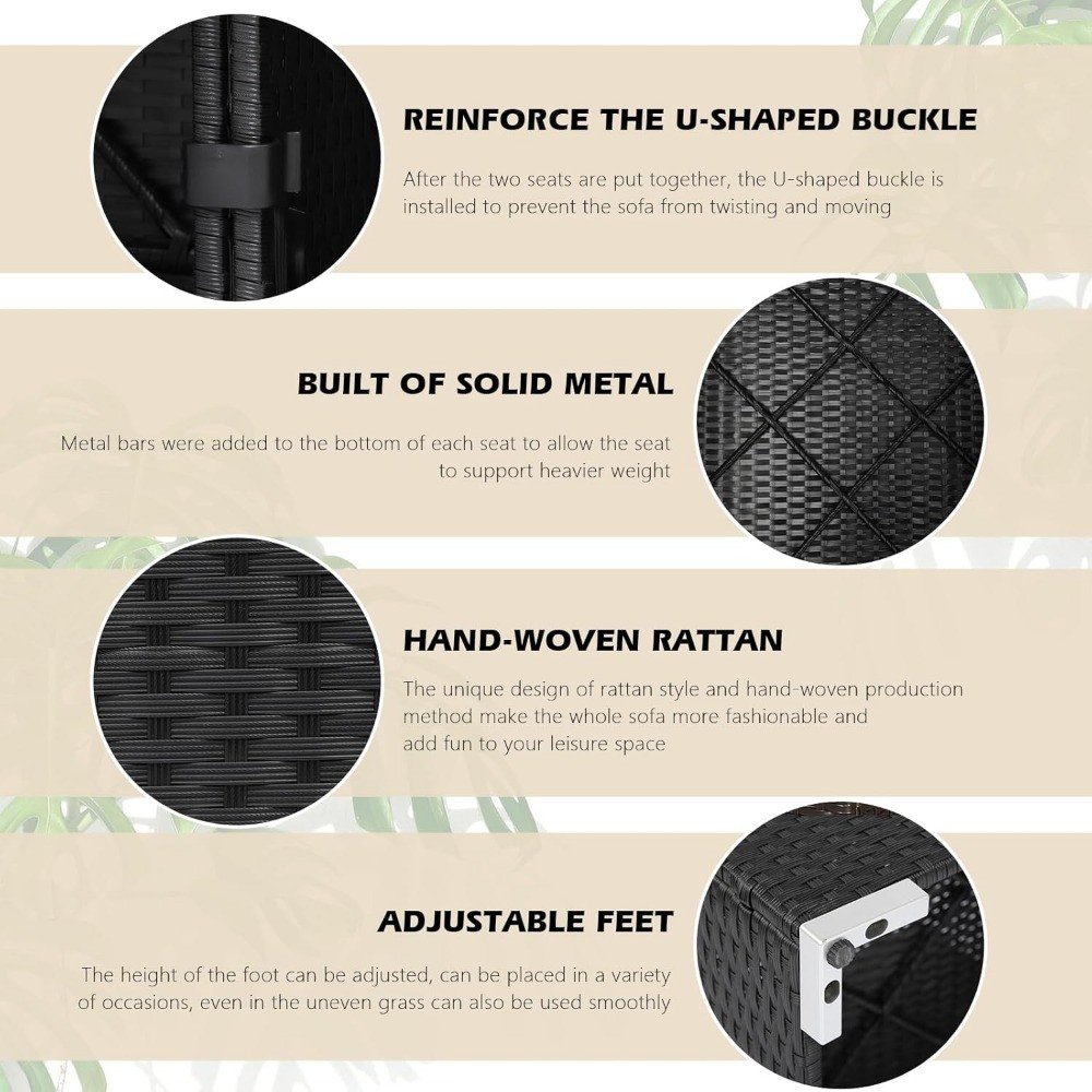 • Quality Materials: Rattan furniture set in the material meet the high standard, double cane woven, in invisible places we also weave, sofa using steel structure, to enhance the service life and support, upright cotton cushion, its characteristic is good air permeability, high elasticity, pressure resistance.
