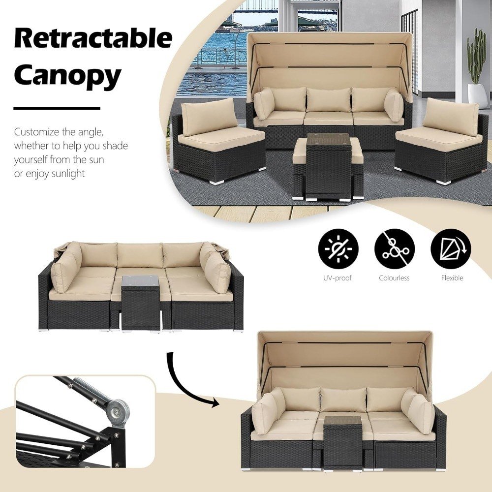 Rattan Furniture Daybed with Canopy 7 Pieces Outdoor Day Bed Wicker Sectional Sofa Set Patio Furniture Set with Adjustable
