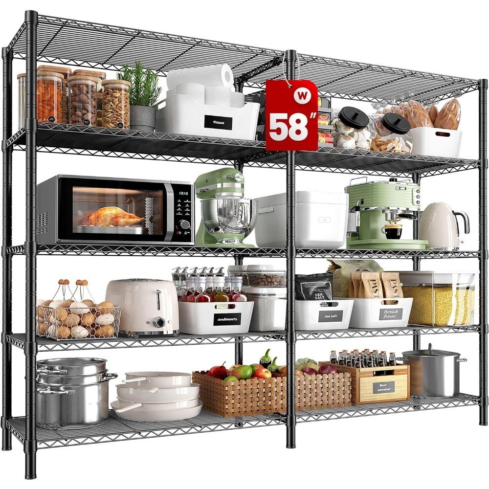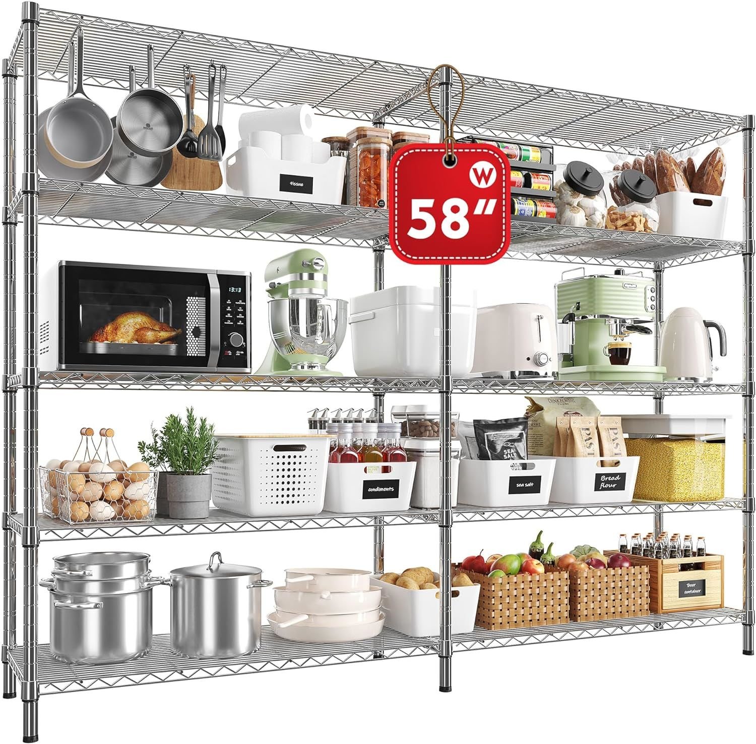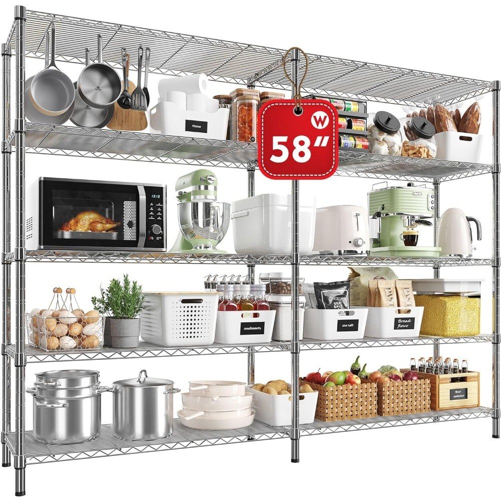 • [58"W X59"H X 13.8"D Monster Size Metal Shelving]You will be amazed by the remarkable size:58"W X59"H X 13.8"D.The capacity of the 58''W storage shelves is twice that of the market shelves, easily meeting your storage needs.This extra wide wire shelving can not only be used as a personal metal shelves for storage in your home, but also as a commercial grade heavy-duty garage shelving in warehouses ,supermarket and more.Large storage rack provide more storage space.