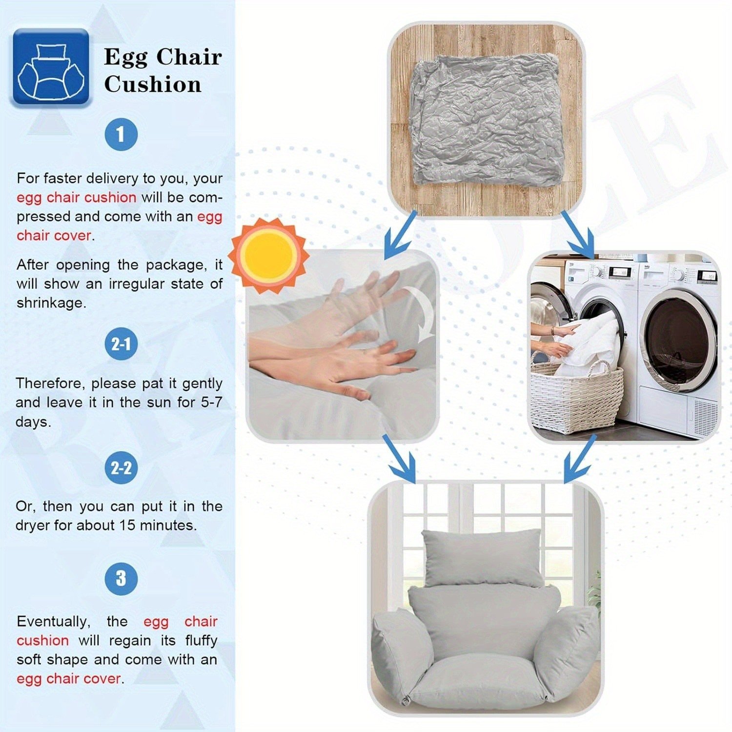 This floor mat is fashionable and versatile, suitable for all seasons. Adds style to any space.Waterproof design makes it easy to clean and maintain. Can be machine washed for convenience.The hanging egg chair cushion is a unique and comfortable addition. Zipper closure ensures durability.Multifunctional and thickened swing chair cushion provides excellent support.Ideal for courtyard gardens, the grey color blends well with any outdoor decor. This 1 set includes only the cushion