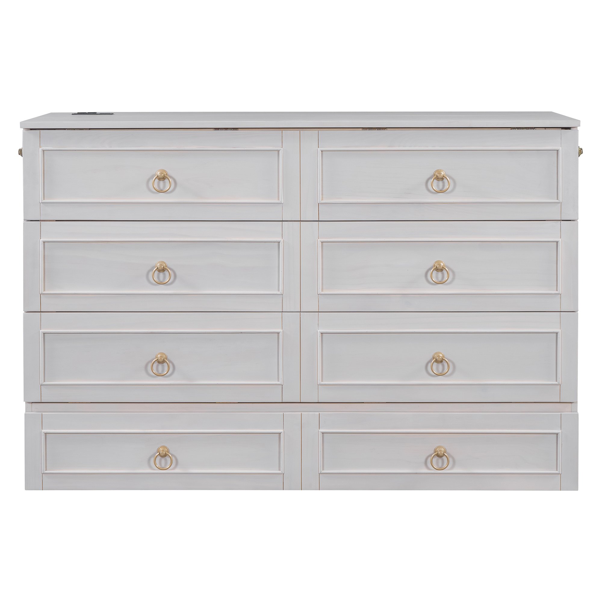 The unique design of the Murphy bed allows it to transform into an exquisite cabinet when folded up, greatly saving space and adding more flexibility to your living space. By fully utilizing space, it makes your room more spacious and tidy.Designed in full size, it can withstand weights of up to 450 pounds, providing a sturdy sleeping environment for you to enjoy ultimate comfort. Whether used by one person or shared by two, it ensures a cozy sleep experience.The bed comes with spacious storage drawers at the bottom, allowing you to easily store bedding, clothes, and other items, keeping your space organized and making daily life more convenient.The front design of the Murphy bed is uniquely crafted, with classic and elegant false drawers on the upper layers and stylish rattan patterned designs on the lower layers. Available in three colors - white, gray, and green - it meets different decoration needs, adding a touch of sophistication to your living space.