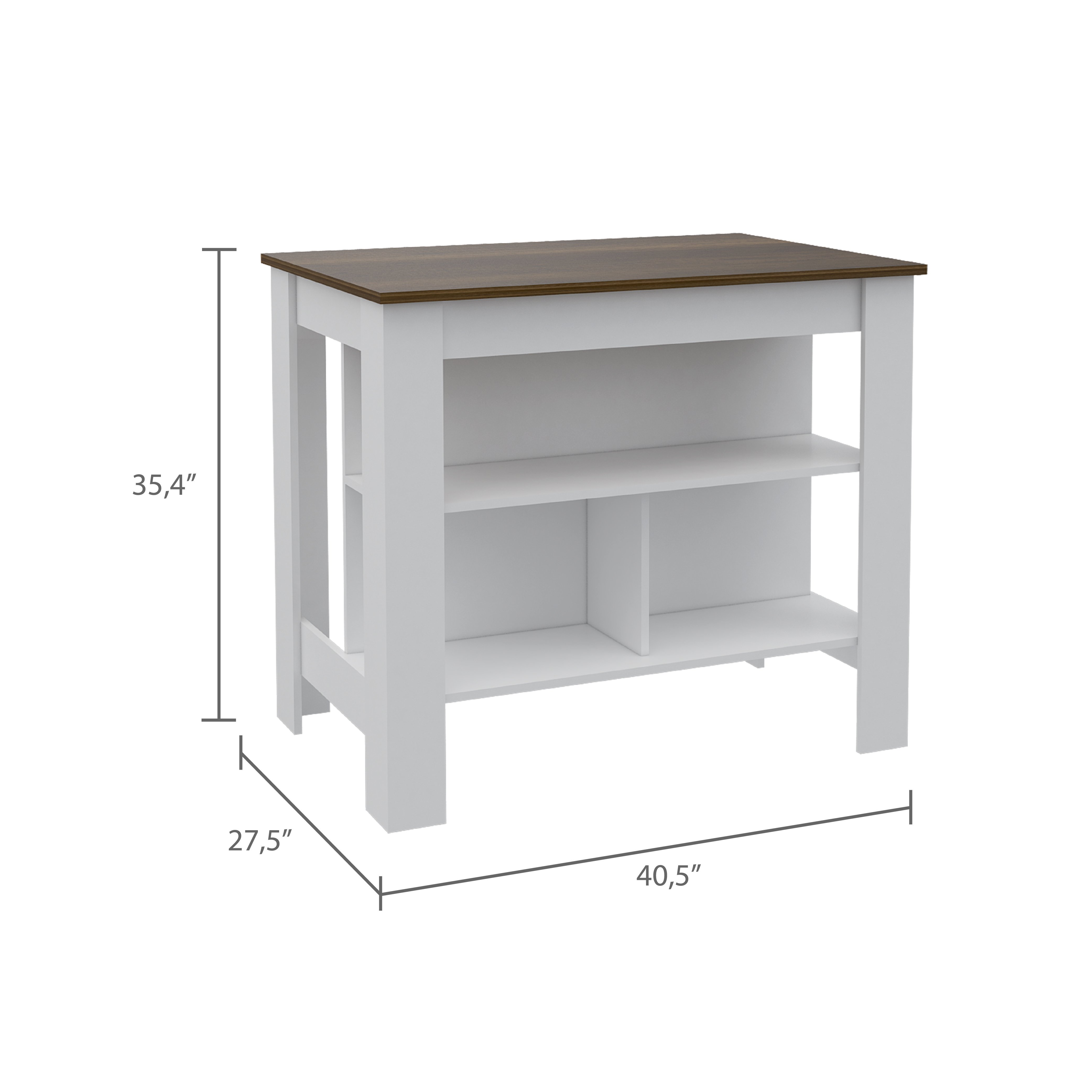 Set includesOne (1) kitchen islandDimensions35.4 inches high x 40.5 inches wide x 27.5 inches deepFinish ColorWhite and WalnutMaterialsManufactured woodNumber of shelves3