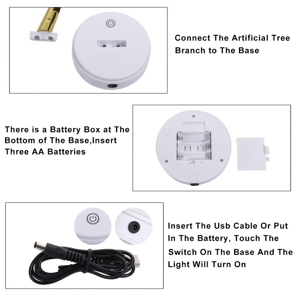 FREE DIY: Golden tape wraps around the trunk; the trunk can be bent at will; you can DIY the trunk and leaves into your favorite shape. TWO POWER SOURCES: The tree light can be powered by 3 AA batteries (not included); or it can be powered by a USB cable. Note: When using the battery; please unplug the USB cable; otherwise it will not light up!