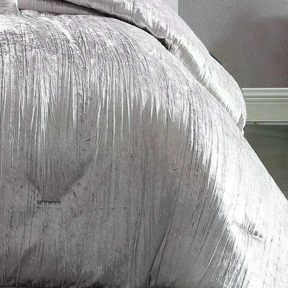 The Turin Velvet 7 Piece Comforter Set is a glam expression of a modern look. Each piece of this comforter set features crinkled velvet for an all-in-one package of luxury bedding. This 7 Piece Set includes: 1 Comforter, 2 King Shams, 1 Bed Skirt, and 3 Bonus Textured Decorative Pillows. Polyester fabric and fill. Machine Washable, follow care instructions on each piece for best results. The digital images we display have the most accurate color possible. However, due to differences in computer monitors, we cannot be responsible for variations in color between the actual product and your screen.