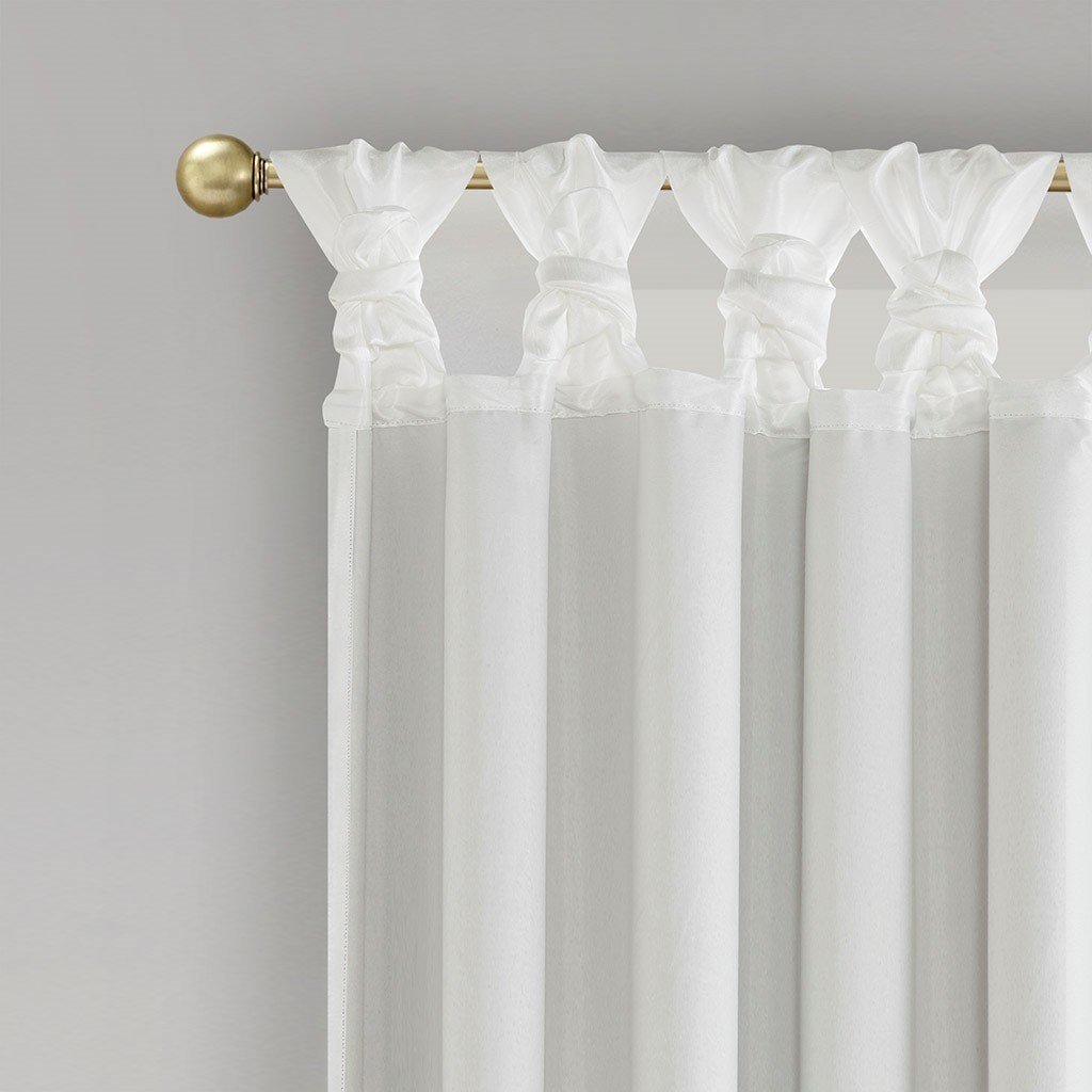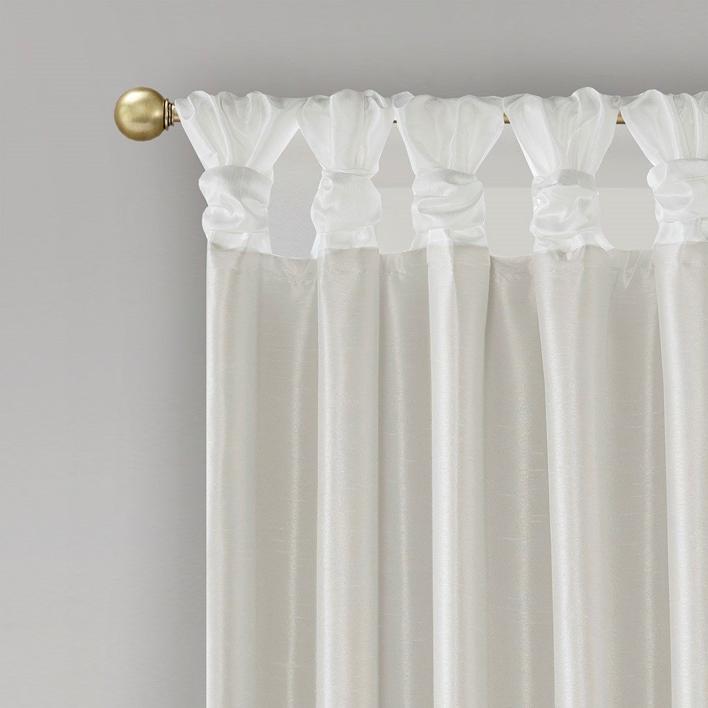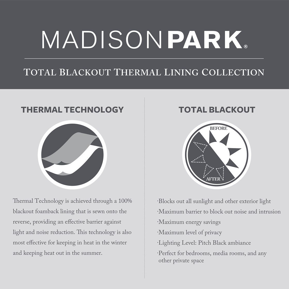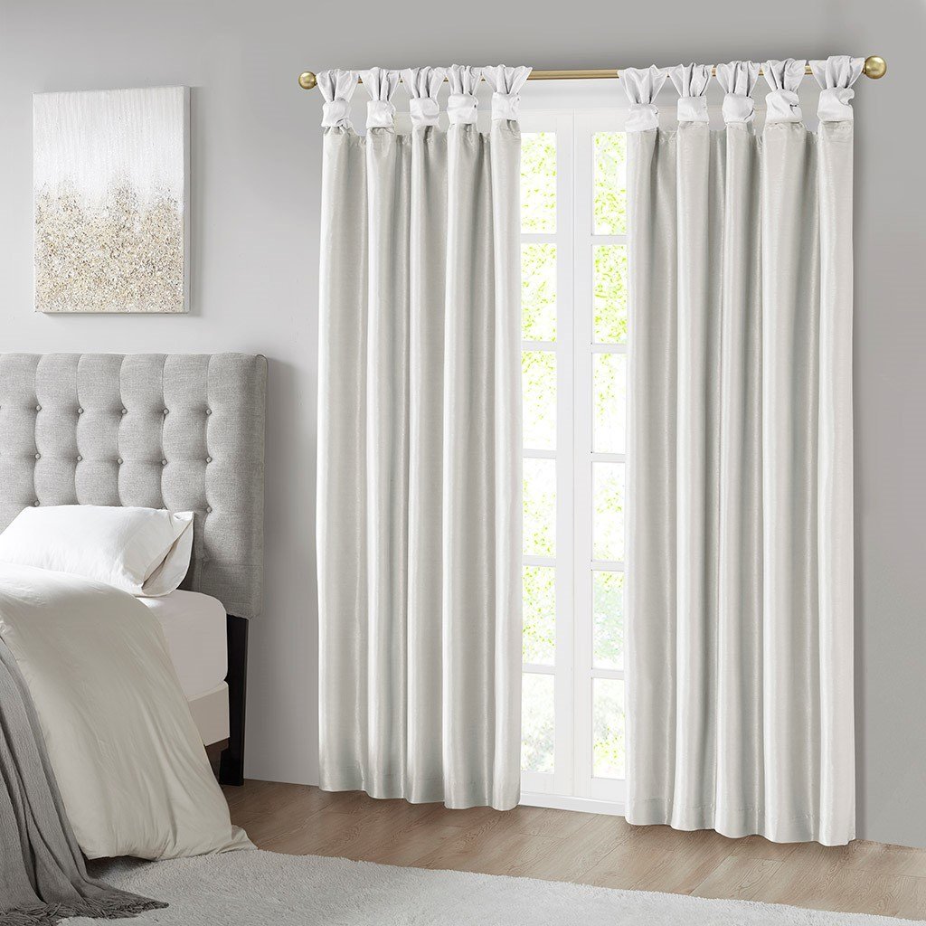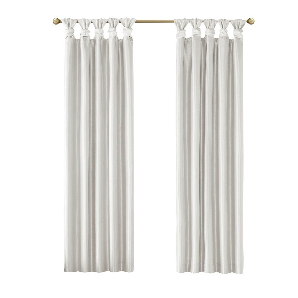 Energy efficiency meets a sophisticate style with the Madison Park Emilia Twist Tab Total Blackout Window Curtain. This white window curtain panel showcases a DIY twist tab top finish that allows you to create an elegant display in your living room or bedroom space. The faux silk sheen base fabric features a 3 pass foamback liner on the reverse to block out all outside light, noise, and intrusion ensuring the highest level of privacy. Using thermal technology, the total blackout curtain helps provide maximum energy savings by keeping your room the perfect temperature through the seasons. This twist tab total blackout window panel is perfect for use in bedrooms, media rooms, or any private space. As shown in the image, two curtain panels need to be purchased for each window; Fits up to a 2' diameter rod.