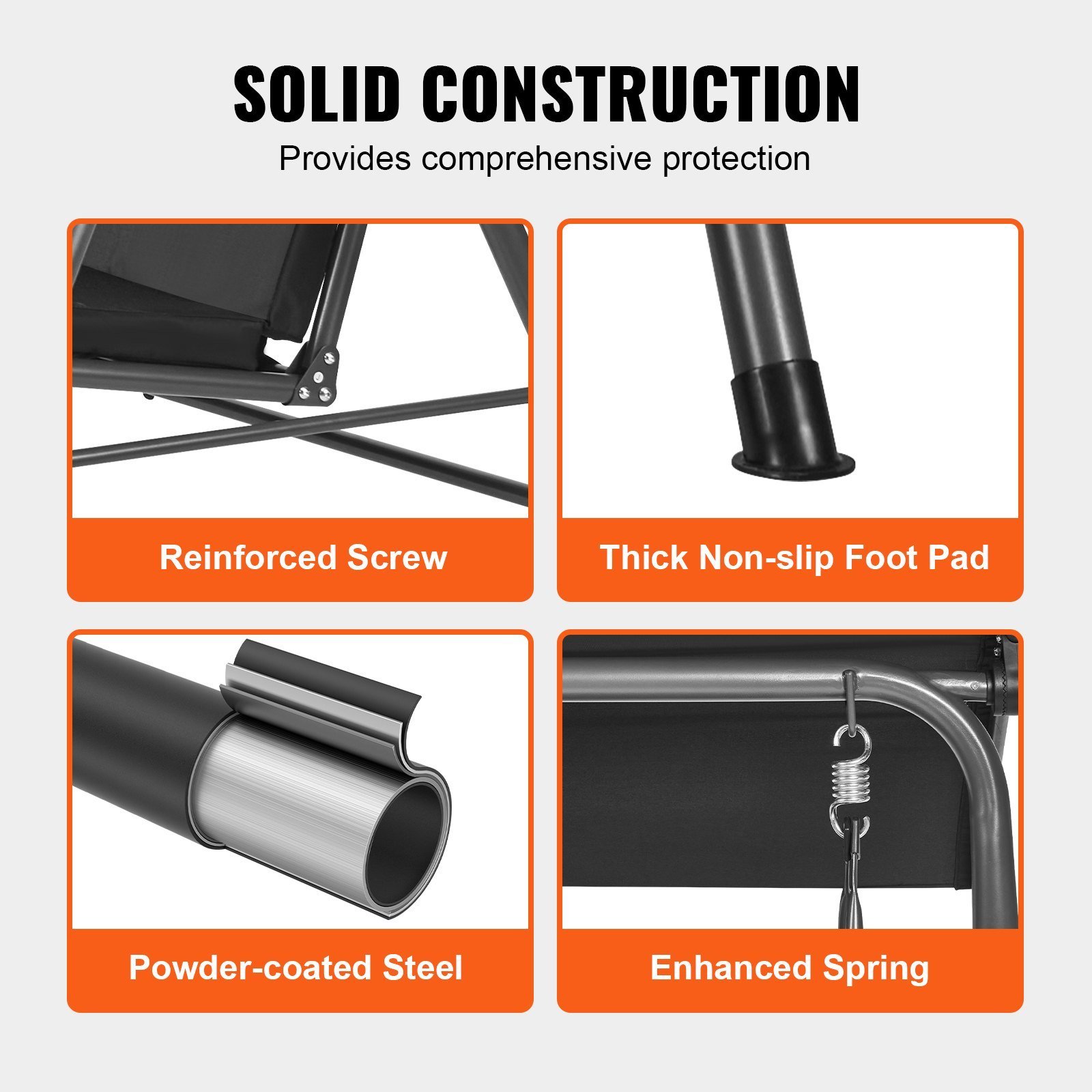 1.Alloy Steel Construction: Crafted from durable alloy steel, this outdoor patio swing features a sturdy triangle frame resistant to high temperatures and abrasion. It withstands outdoor elements without rusting and supports up to 440 lbs, comfortably accommodating 2 people for swinging fun.