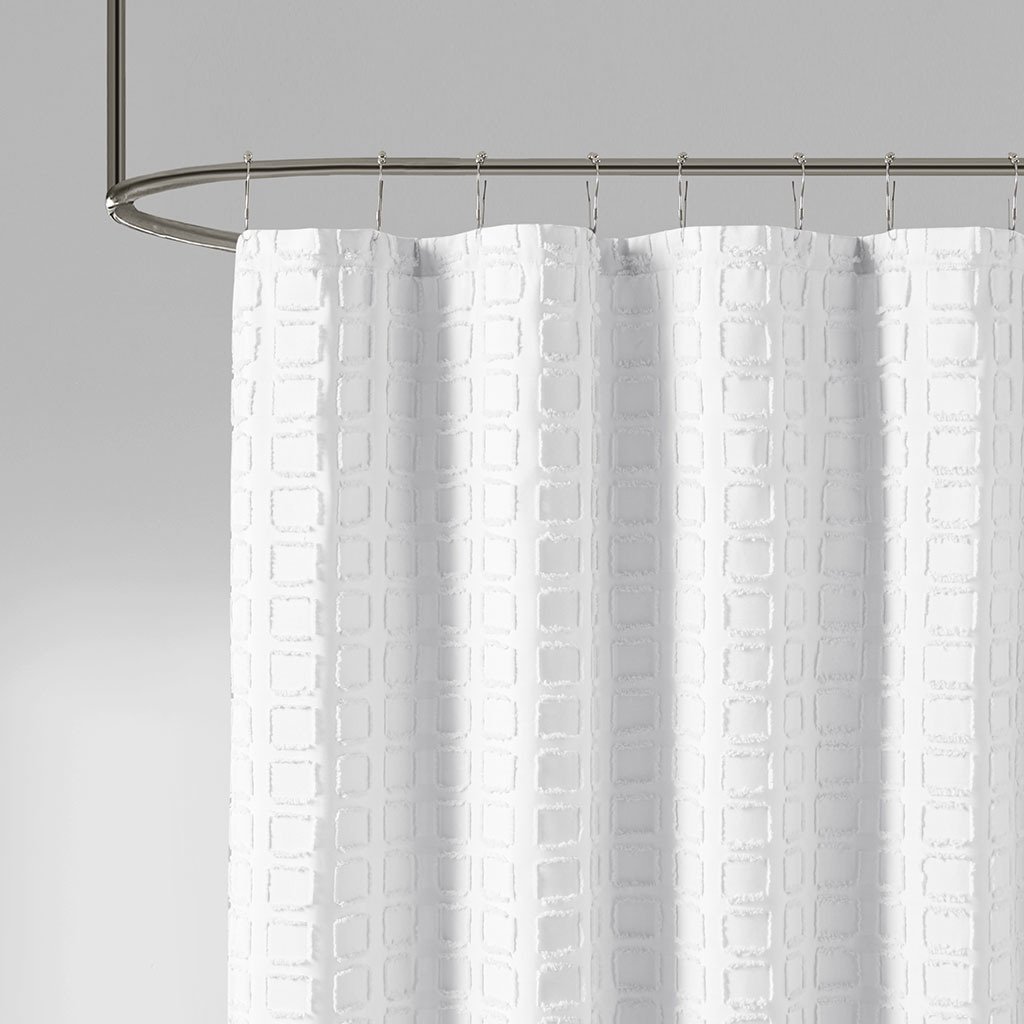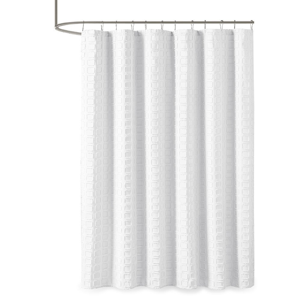 Elevate your bathroom decor with the Madison Park Metro Woven Clipped Solid Shower Curtain. This solid white shower curtain features a woven square geometric design with a clipped treatment to create beautiful texture and dimension, for an updated look. Measuring 72'x72', this shower curtain adds a chic modern touch to your bathroom and is machine washable for easy care. A water repellant liner is not included, but highly recommended and can be purchased separately.